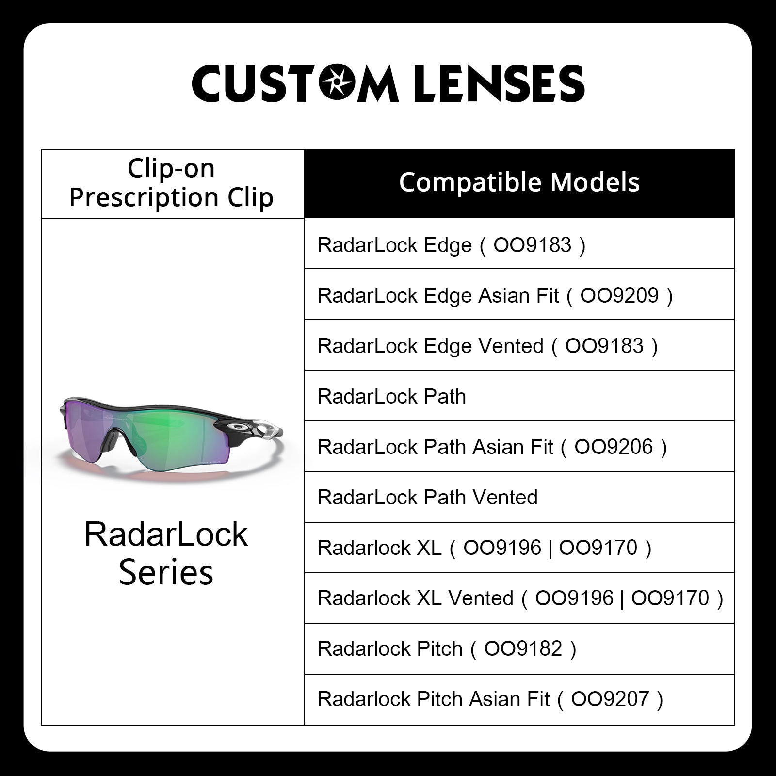 Custom Insert Clip-On & Prescription Lenses for Oakley RadarLock Sunglasses